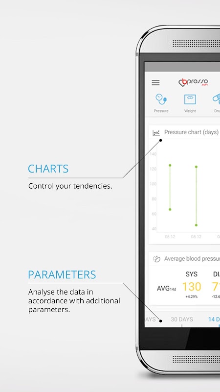 "bpresso PRO" is een applicatie waarmee je kunt verzamelen en analyseren van uw bloeddrukmetingen en alle aangesloten activiteiten, zoals: pulse, drugs genomen, fysieke inspanning en gewicht.