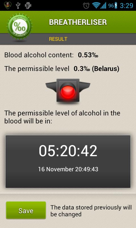 If Breathalyzer shows you that your current alcohol level in blood does not allow you to drive, you can select an option "Wake me up" and the application will wake you up automatically when your alcohol level in blood is acceptable.