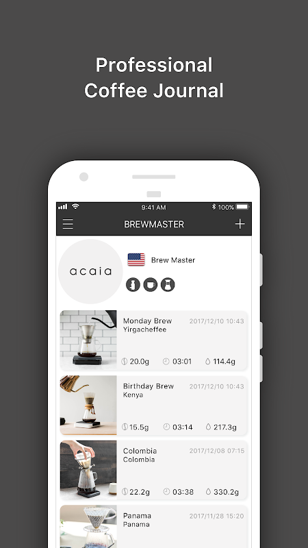 Log je koffiezetsysteem moment met Brewmaster. Met behulp van de acaia schaal met de Brewmaster om mooie en informatieve gevisualiseerd koffiezetsysteem gegevens die u helpt om uw brouwen beter te leren kennen te creëren.