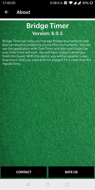 Brug Timer zal u helpen om Bridge toernooien te beheren en kan ook om jezelf voor te bereiden op toernooien. U kunt de applicatie met OverTimer gebruiken en na elk bord een verloop van tijd timer begint. U zult hebben om het te stoppen als u het bord afmaken, Met deze optie bent u in staat om te zien hoeveel tijd je nodig hebt om een bord af als het meer dan de reguliere speeltijd.