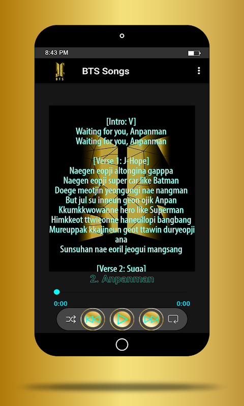 BTS (Bulletproof Boy Scouts) songs and lyrics, this application comes up with lyrics for every song and could running OFFLINE mode (no need internet), attractively displayed with colorful design styles. BTS Songs and Lyrics app was made for free and can be saved into your External Memory device.