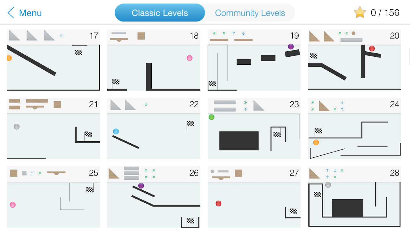 Gebruik de geleverde stukken en power-ups om creatieve oplossingen te bedenken om de bubbel naar het doel te krijgen! Er zijn twee soorten stukken, hout en metaal. Houten stukken worden beïnvloed door de zwaartekracht wanneer je op Start tikt, terwijl metalen blijven waar je ze hebt geplaatst. Gebruik power-ups om de bubbelsnelheid te verhogen en zelfs de zwaartekracht om te keren! Wil je niet bij het begin beginnen? Je kunt naar wens rondspringen en direct in de 156 spannende levels springen (begin met 48 levels en upgrade vervolgens naar de volledige versie van Bubble Ball voor alle 156 levels).