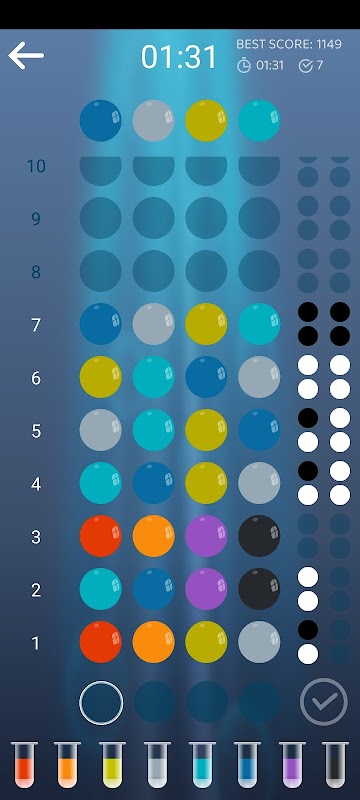 With each attempt, the player gives his proposal of how to arrange the bubbles. He receives a response in the form of 4 slots, the slot can be empty or planted with a white or black ball. An empty slot means that one of the bubbles does not appear in the code. White ball means that one of the bubbles is in the code but in a different place. A black ball means that one of the bubbles is in the right place in the code.