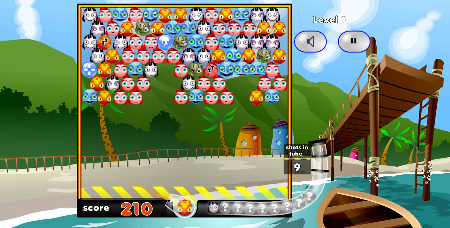Fire the Borbs and release them from the board by making groups of three or more. Bubble Town 2 features 50 levels, upgraded graphics, power ups, and the ability to swap borbs in the cannon. Release all of the Borbs from the screen to complete levels. The Borbs will move down if you run out of Borbs to fire, and the game is over if the Borb's reach the danger zone.