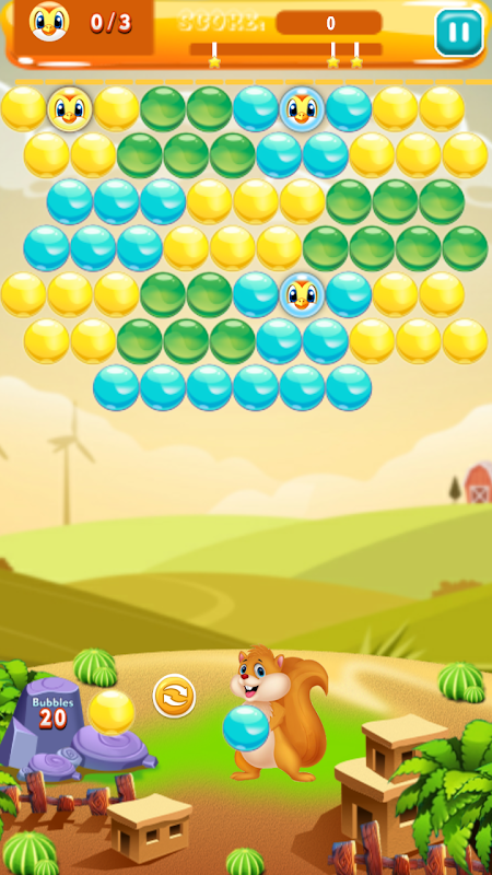Try to unlock all levels if you can.Clear all bubbles on the screen and help hero squirrel pop the bird bubbles to rescue birds and to complete levels and try to get 3 stars on each level to make high score.