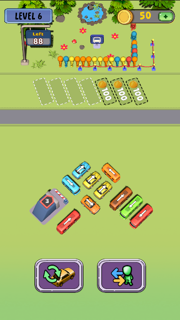 Passagiers staan in verschillende kleuren opgesteld (groen, roze, rood, geel, enz.). Je moet het voertuig met de juiste kleur naar de ophaalzone verplaatsen zodat ze kunnen instappen.