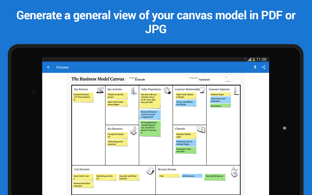 U kunt uw model automatisch te bouwen en Model Canvas delen via e-mail, facebook en op te slaan op uw geheugenkaart!