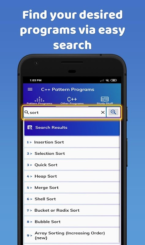 Deze app zit vol met patroon- en andere C ++ -programma's. Daarnaast zijn er ook veel studiemateriaal gerelateerd aan C ++ programmeren.