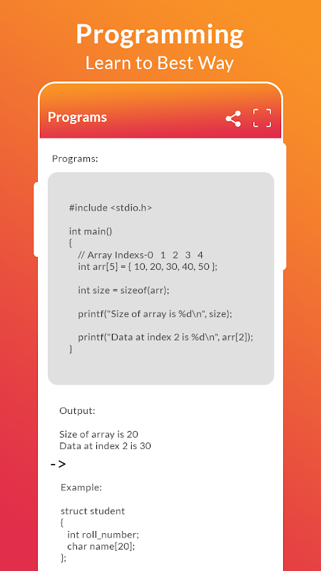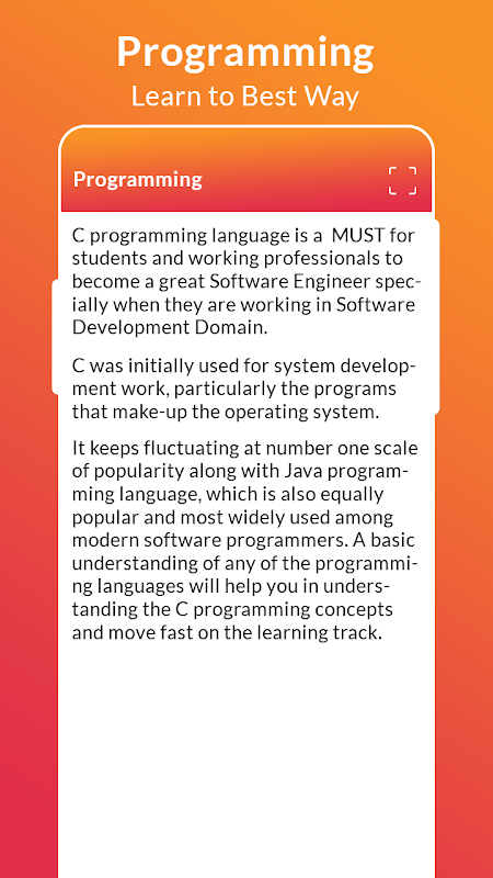This C language Application Provide to still your developing stage is level up so you can learn the too easy way.
