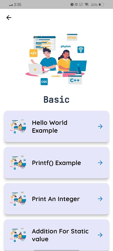 De app "Learn C Programming" heeft een heel eenvoudige en intuïtieve gebruikersinterface. Het is