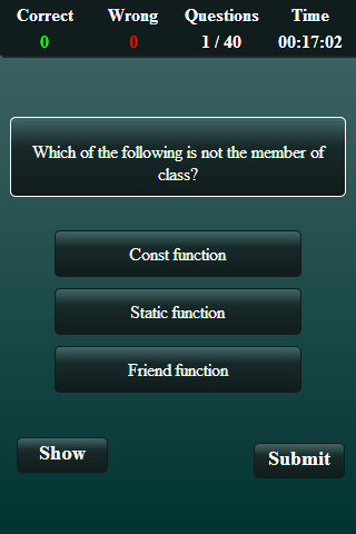This application has been developed for testing your C++ Programming language skills. This is a latest and fantastic new education application which has been fueled with lots and lots of interesting questions that test you intelligence in the subject. It has more than 1000 multiple choice questions and answers and these cover a wide range of varieties of topics. General knowledge starting from basic to high level C++ Programming can be found in this app.