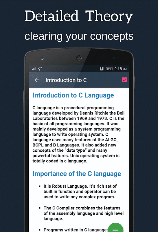 1. Theory : All of the C Programming theories are included in this app to help u learn.