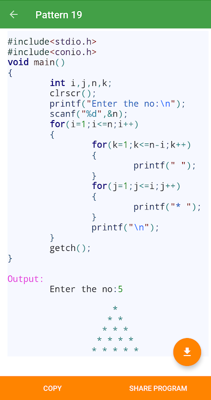 Bouw uw programmeervaardigheden op via de praktische C Voorbeelden-app met uitvoer. App helpt u een expert in C-programmeren te worden door u de nodige codering en voorbeelden te bieden. Het is de beste app voor het leren van programmeertaal.