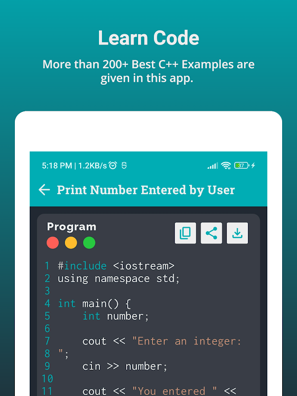 Het leren van C++-programmeertaal met behulp van oefeningen is een gemakkelijke manier om snel te leren programmeren. In deze app bevat elk onderwerp zijn eigen voorbeelden met unieke resultaten.