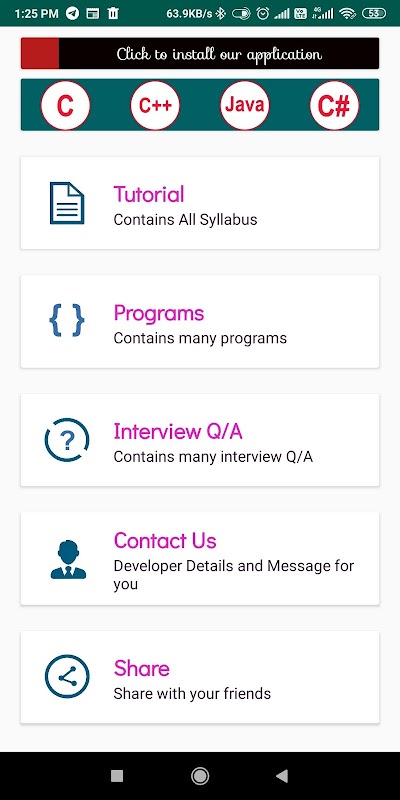 Dit is de enige app waarin je de hele syllabus van C # -taal kunt leren met tutorials, programma's en interviewvragen en -antwoorden.