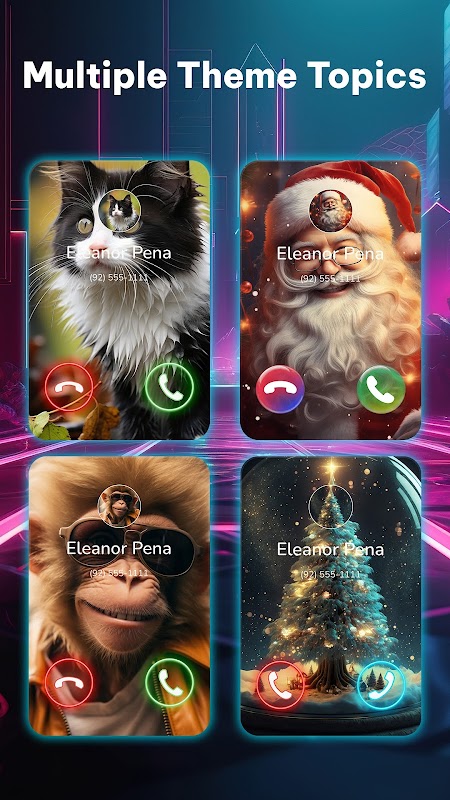 Laat uw inkomende oproepen er leuk uitzien met een unieke stijl in slechts 1 klik, verander de oproepachtergrond met meer dan 80 sjabloonideeën van de app Telefoongesprekthema. Met populaire en trending thema's, unieke aanpassingen en vele functies is Call Theme - Color Phone Call een onmisbare app om het telefoonscherm te wijzigen en uw stijl aan te passen telkens wanneer uw inkomende oproep overgaat.