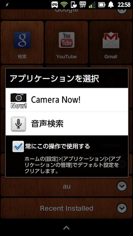 (Please choose Camera Now! on the application selection screen displayed by long pressing of a search button. it is 1'st time only)