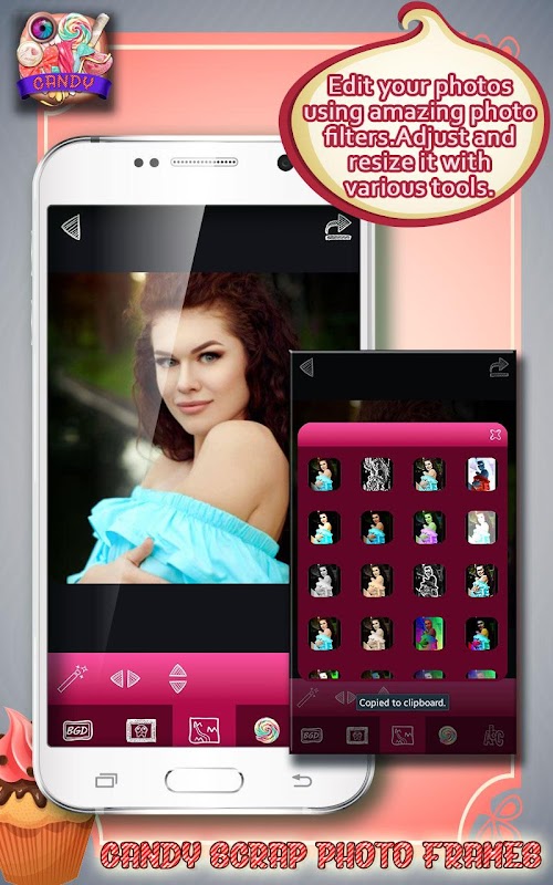 Check out the sweetest "free photo editor" on the market and decorate your selfies with candy cane pic frames, cute photo stickers and other photo editing features included in our brand new ★Candy Scrap Photo Frames★ mobile app! If you are passionate about image editing and scrapbooking, then "Candy Scrap Photo Frames" is a perfect "selfie photo editor" for you, so go download it now for FREE and see all the amazing pic editing and scrapbooking options it offers! Decorate you photos with cool candy photo stickers and stamps, lovely scrapbook patterns and decorations and loads of "photo effects and filters" and make beautiful photo art on your smartphone!Try it now and fall in love with ★Candy Scrap Photo Frames★ today!