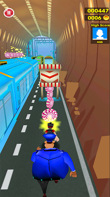 Doe mee aan een spel met Candy Train Rush, waarbij het je doel is snoepjes te verzamelen terwijl je vermijdt dat je wordt gevangengenomen door een achtervolgende politieagent. Pas op, want het spel eindigt als de politieagent je aanhoudt.