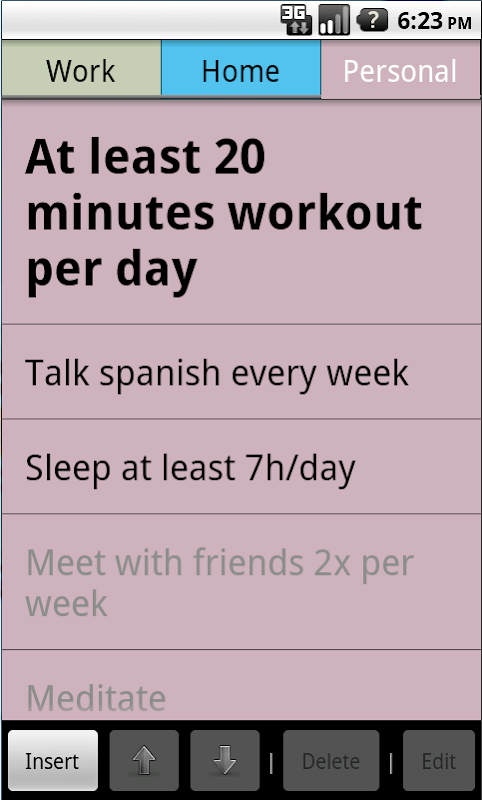 - When you have some spare time (or you have reserved the time for self improvement), open the application, choose a category (if at work, then probably work, if at home than home or family,...) and do the FIRST thing on the list as long as you can or until it is finished. Do not try to do the second or third, because you feel like it or it is easier! Do the first one.
