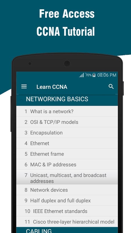 CCNA (Cisco Certified Network Associate) is a certification from Cisco, the world’s most famous company that manufactures and sells networking equipment. This certification helps you to become familiar with a wide range of topics. This app will help you easily learn CCNA and Practice any time.