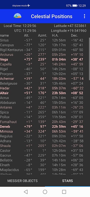Lijst met hemelposities met objecten van Messier en heldere sterren op uw locatie