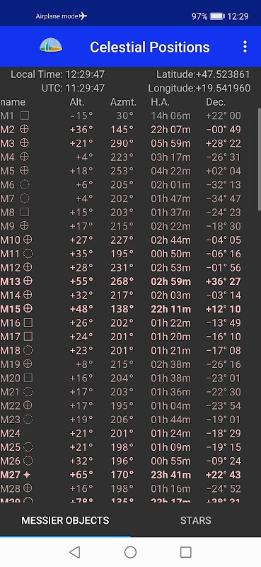 Dit is een applicatie die de huidige positielijst van Messier's objecten en heldere sterren op jouw locatie laat zien. Het is handig om een niet-gecomputeriseerde telescoop op Messier's objecten te richten.