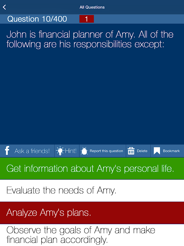 CFP practice exam simulator is a free cfp exam prep app, study guide and cfp review for Certified Financial Planner examination. It is a complete CFP Review and study guide to prepare you for actual cfp exam by taking CFP practice exam , studying CFP flashcards and mock test. This application is designed to take CFP practice exam questions on the go without internet on your mobile device. CFP practice exam prep app record you performance, gives a comprehensive cfp review and highlight the weaker area to let you focus on them while studying for Cfp exam questions. All questions are formulated by experts closer to the actual Cfp exam questions.