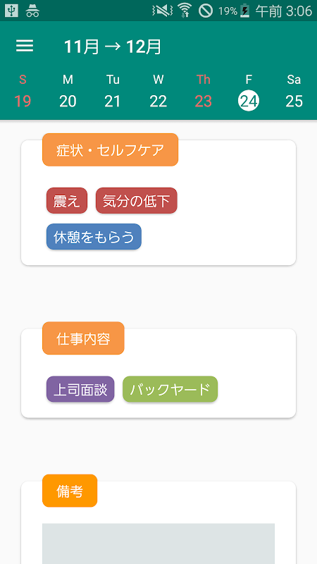 【記録】睡眠時間や症状の有無など、毎日の体調記録がつけられます。項目は自由に変更することができます。