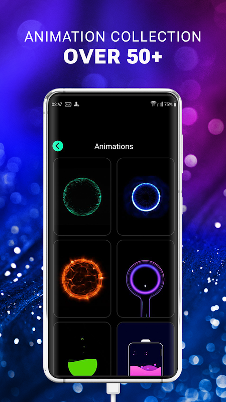 Geluidsanimatie van de lader is animatie voor het opladen van de batterij en het geanimeerde oplaadscherm biedt een snelle en gemakkelijke manier om een professionele verbluffende geanimeerde batterijoplaadshow te maken. Nu is het gemakkelijk om het batterijniveau van uw telefoon te identificeren op het vergrendelscherm en startscherm van uw mobiele telefoon.