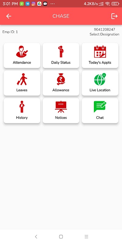 Chase (Employee tracker) helpt u bij het volgen van werknemers die op het veld zijn. Werknemer/gebruiker moet inchecken via dagelijkse aanwezigheid.