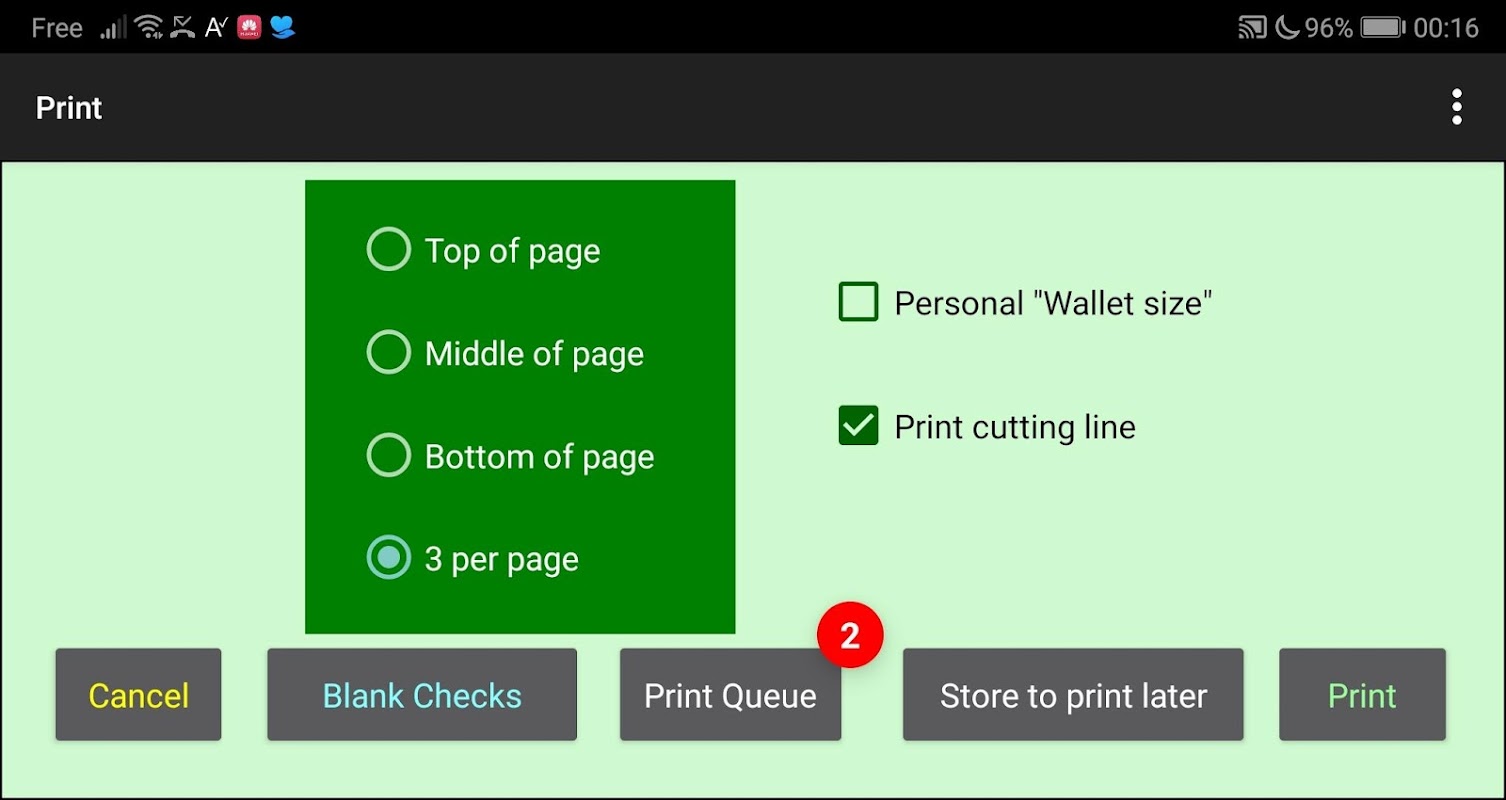 Zakelijke cheques en persoonlijke "portemonnee" -cheques worden ondersteund. Eén vinkje bovenaan, midden of onderaan (voucher) of 3 per pagina.