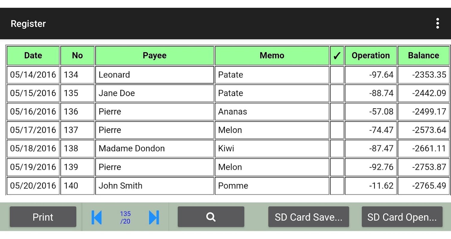 Dat register kan naar believen worden gewijzigd. Lijnen kunnen worden toegevoegd of verwijderd, om hetzelfde te doen als bij een papieren chequeboek. Transacties kunnen worden verzoend met een vinkje.