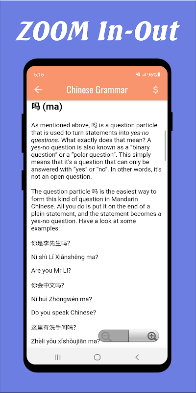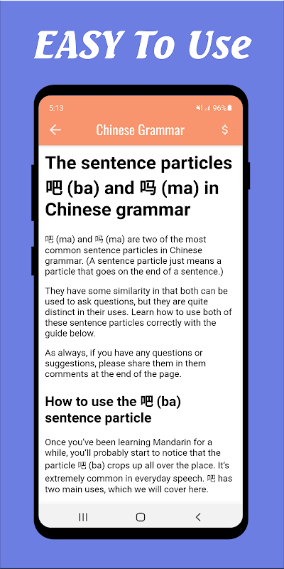 De app is ontworpen en ontwikkeld om de studie van de Chinese grammatica te vergemakkelijken. Met deze applicatie kun je gratis Chinees leren met meer dan 50 lessen. Leer Chinese grammatica met deze geweldige app en verbeter je Chinese grammatica. De app gebruikt geen internet om gegevens te laden. Dus we kunnen overal en altijd Chinese grammatica leren.