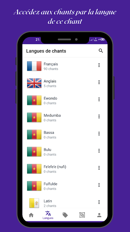 Les chant sont regroupés en catégories (plus de 100 catégories de chants) et en langues (plus de 50 langues).