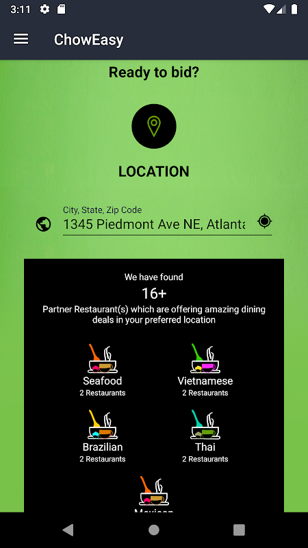 When you are ready to save money on your favorite food, go the Bid Screen in your ChowEasy App and select the Type of Cuisine, Area and other Criteria. Review your selections and Confirm your Bid.