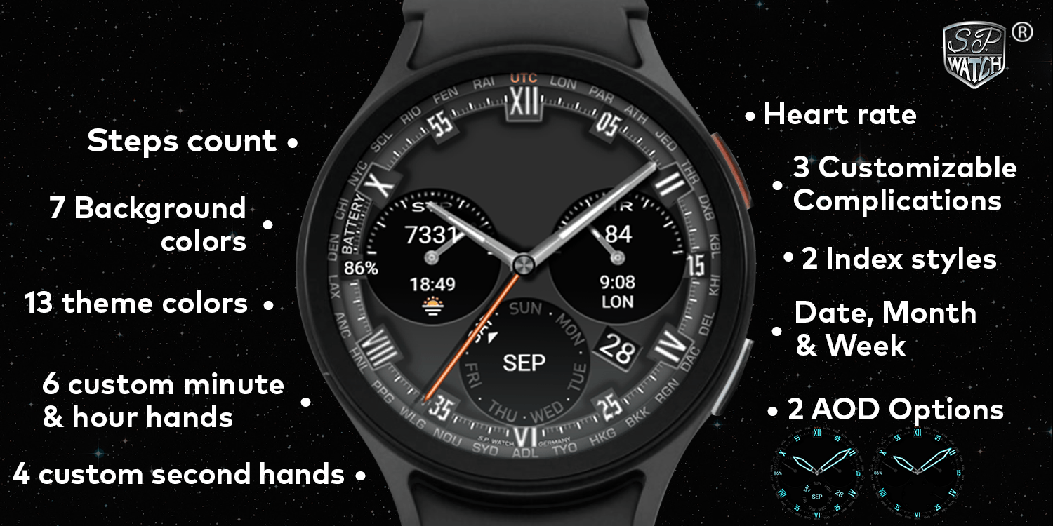 Deze wijzerplaat is aanpasbaar en biedt 13 themakleuren, samen met 7 achtergrondkleuren, 3 aanpasbare complicaties en 6 verschillende wijzers. Het is ontworpen om gebruikers de flexibiliteit te bieden om het uiterlijk van hun smartwatch te personaliseren, zodat het bij hun persoonlijke smaak past.
