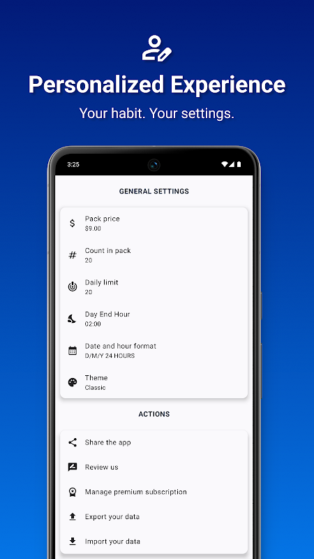 - Daglimietfunctie om je rookgedrag te verminderen.