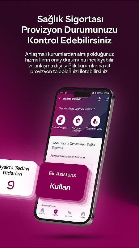 Via de gebruiksvriendelijke interface van de QNB Sigorta mobiele applicatie kunt u de details van uw Zorg, Leven, Persoonlijke Ongevallen en Pensioen producten inzien en uw transacties eenvoudig uitvoeren.