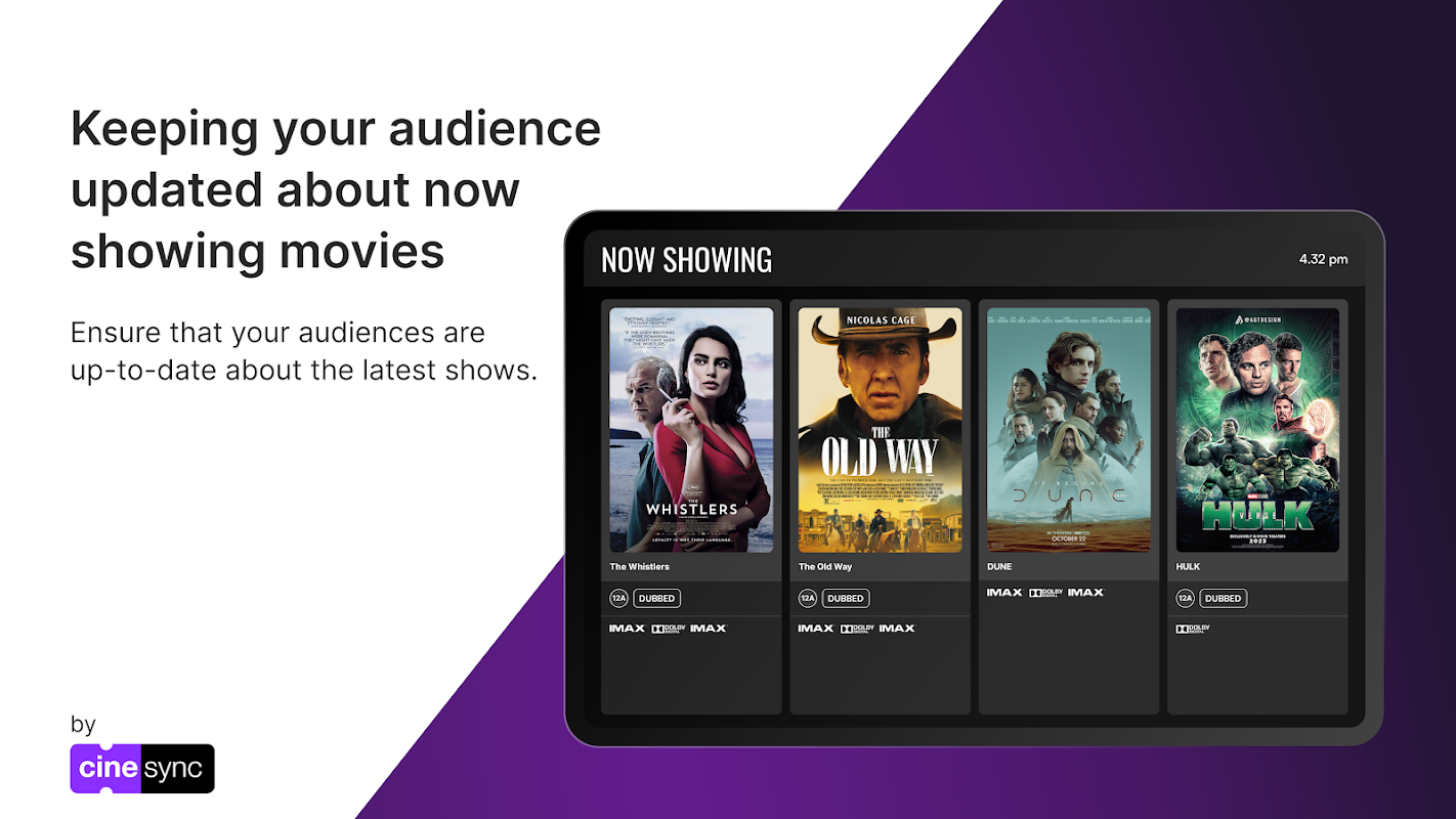 CINEsign is een gebruiksvriendelijk digital signage-platform dat naadloos integreert met CINEsync-bioscoopsoftware. Met CINEsign worden uw films, evenementen en aanvangstijden automatisch gesynchroniseerd met uw aangepaste afspeellijsten. Het platform werkt onafhankelijk, zonder dat er connectiviteit nodig is, en levert samenhangende en meeslepende ervaringen voor uw klanten terwijl het de processen voor uw bioscooppersoneel stroomlijnt.