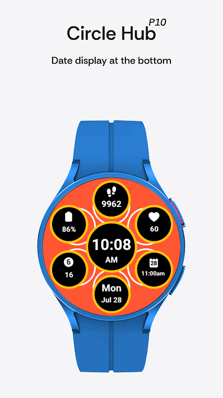 Deze moderne wijzerplaat houdt je essentiële gegevens centraal met een strak, minimalistisch ontwerp. De tijd wordt in het midden weergegeven en schakelt automatisch tussen 12- en 24-uursnotatie, afhankelijk van de instellingen van je apparaat.