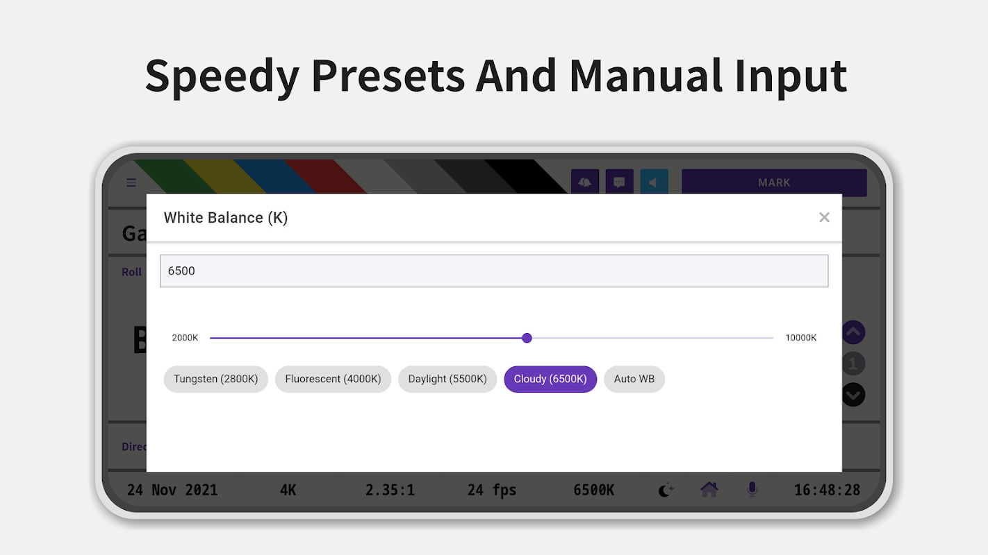 No more sore throat caused by yelling. We've got you covered. Simply tap on Mark and we will take it from there. The clapperboard can call out the scene and take number, and shout Mark for you, followed by the classic or soft clapping sound, with indicating lights.