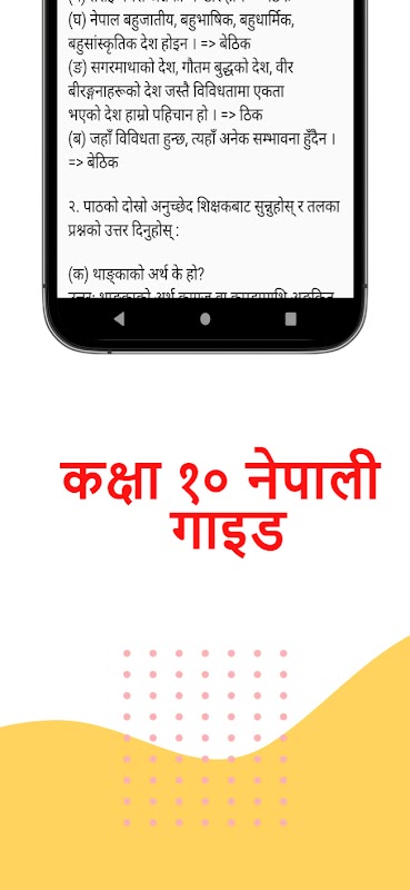 Class 10 Nepali Guide is een app die studenten en docenten een gratis offline oplossing biedt. Het bevat klasse 10 hoofdstukgewijze oplossingen, waaronder korte vraagantwoorden, sabda artha, bykha gara en nog veel meer oplossingen van boeken. Het helpt studenten bij het behalen van een hoge score op het SEE-examen (het eindexamen van klasse 10).