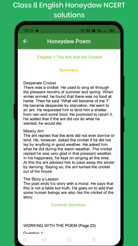 Deze app is op de meest systematische manier een aggregaat van de hoofdstukgewijze oplossing van het Engelse honingdauw-leerboek van klasse 8. Het zal helpen bij een snelle herziening als je onze app leuk vond. Beoordeel ons alstublieft.