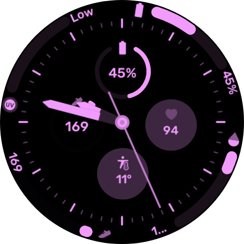 Een strakke Wear OS-wijzerplaat, ontworpen voor minimalisten die houden van strakke esthetiek, vloeiende animaties en een batterijzuinig always-on display.