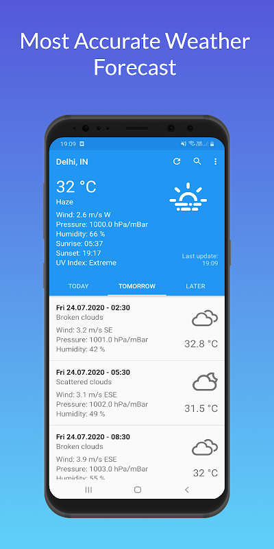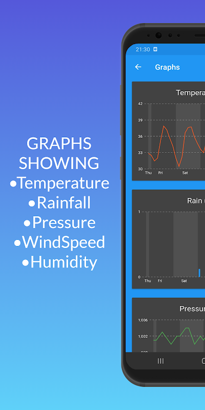 Bovendien toont het zelfs UV-INDEX, ZONSOPGANG, ZONSONDERGANG & heeft het 5 GRAPHS die verschillende weersattributen tonen en WEERMAP die 4 verschillende soorten weersomstandigheden laat zien.