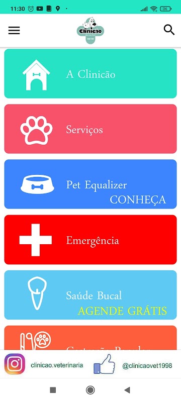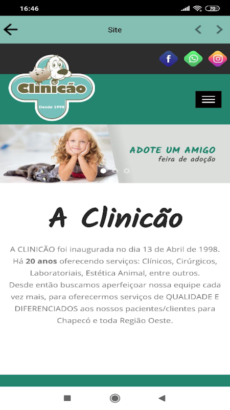 Institutionele toepassing van de veterinaire kliniek en Petshop Clinicão Chapecó SC. Hoe er te komen, wie we zijn, over ons, onze diensten, promoties en korting, social networking, fotogalerij, website, blog, onderzoek en meer informatie.