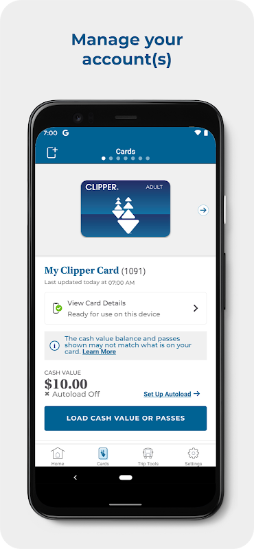 De Clipper-app geeft je dezelfde accounttoegang als de website, maar dan op je telefoon! U kunt een nieuwe kaart registreren, contante waarde en transitpassen laden, Autoload instellen, uw recente activiteit bekijken en andere functies. U kunt ook meerdere Clipper-kaarten op één plek beheren.