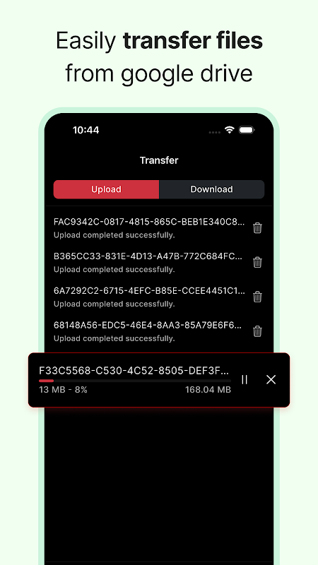 Moeiteloos uploaden en downloaden: upload eenvoudig foto's en video's van de lokale opslag van uw apparaat naar uw Google Drive-account en download bestanden van Google Drive naar uw apparaat met slechts één tik.