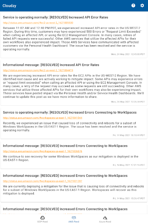 Cloudzy is a free and open-source app that gets you the latest alerts for major cloud providers and displays them in an easy-to-read manner. We provide tailored notifications for the cloud providers you care about the most.